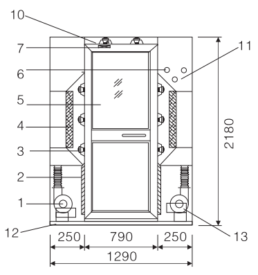 Quạt hai tốc độ 2. Bộ lọc hiệu suất sơ cấp 3. Vòi phun bằng thép không gỉ (quay 360 độ) 4. Bộ lọc hiệu suất cao không có vách ngăn 5. Cửa sổ quan sát bằng kính cường lực 6. Đèn báo 7. Thiết bị đóng cửa nhập khẩu 8. Cảm biến hồng ngoại 9. Bảng điều khiển (có nắp mica) 10. Khóa từ 11. Công tắc dừng khẩn cấp (tổng 3 cái) 12. Bu lông móng (M12) 13. Lỗ xả áp